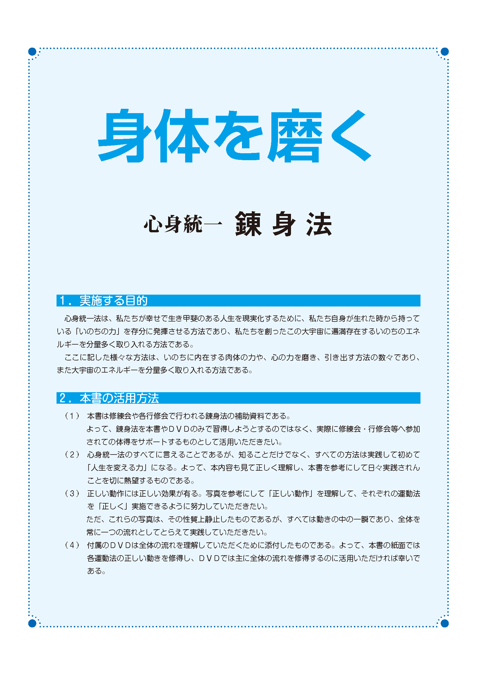 錬身法を本教材のみで習得しようとするのではなく、実際に修練会・行修会等へ参加されての体得をサポートするものとして活用してください。